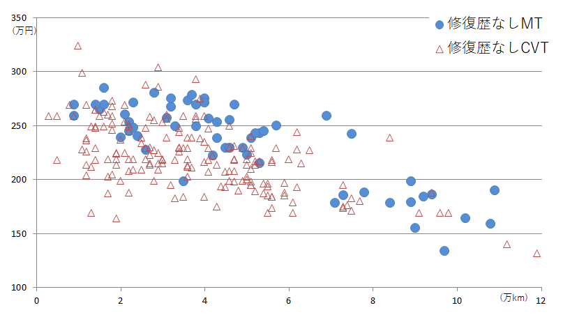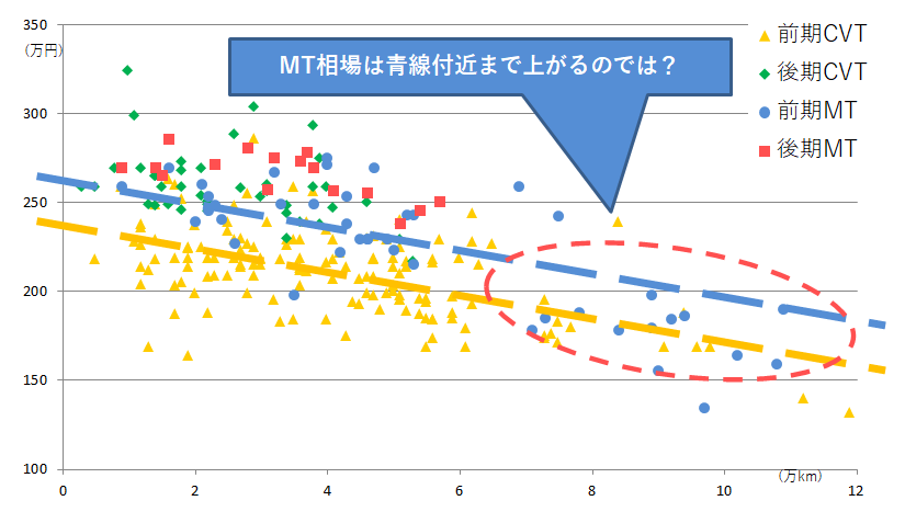 - 走行距離7万km以上ではMT相場はCVT相場と同様の価格