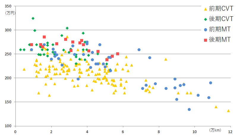 その為後期の走行距離は4万km以下が多く、販売価格は高めです。(緑・赤プロット)