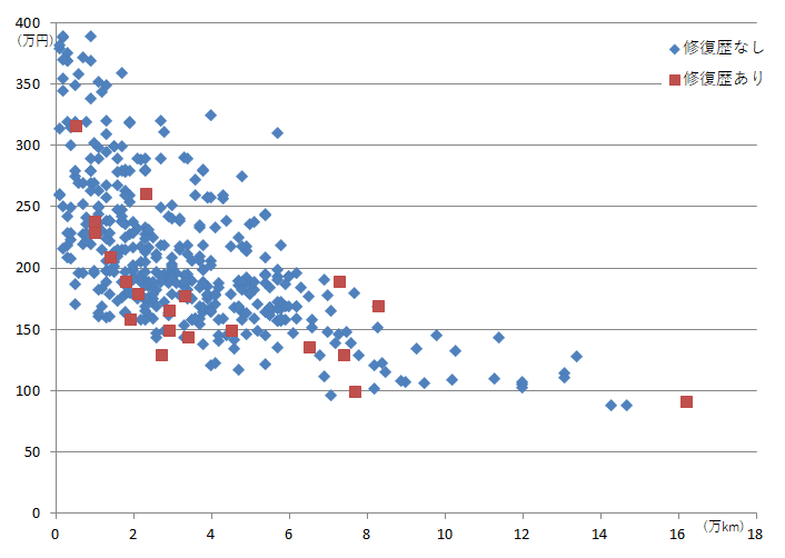 ※ここからは修復歴ありの車両20台を除いたデータです。