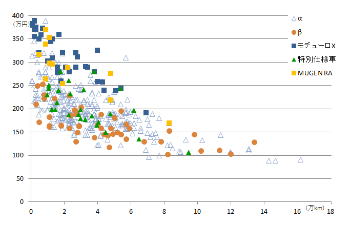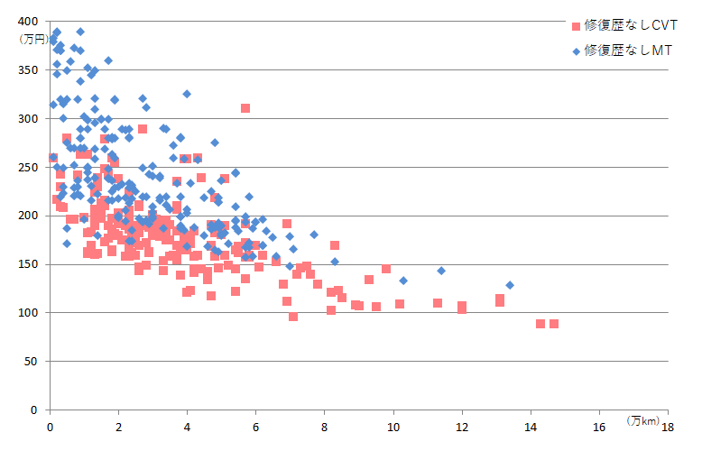 CVT(赤プロット)は走行距離が増えれば増えるほど、価格が右肩下がりになっていますが